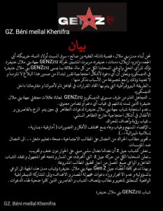في تطور لافت يعرفه الحراك الذي يقدمه البعض كصوتٍ لجيلٍ جديد، أعلن عدد من الشباب المنتمين لمدن جهة بني ملال خنيفرة انسحابهم الكامل من حركة “GENZ212”، معلنين في بيان رسمي تبرّؤهم من أي علاقة تنظيمية أو دعوات مستقبلية تصدر باسم ما يسمى “GENZ212 بني ملال خنيفرة” على منصة “ديسكورد”.