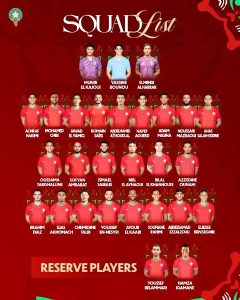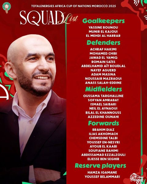 وجّه الناخب الوطني وليد الركراكي، مدرب المنتخب الوطني الأول لكرة القدم، الدعوة إلى 28 لاعباً للمشاركة في نهائيات كأس إفريقيا للأمم التي ستستضيفها ملاعب المملكة في الفترة ما بين 21 دجنبر 2025 و18 يناير 2026، ضمنهم لاعبين اثنين في اللائحة الاحتياطية .